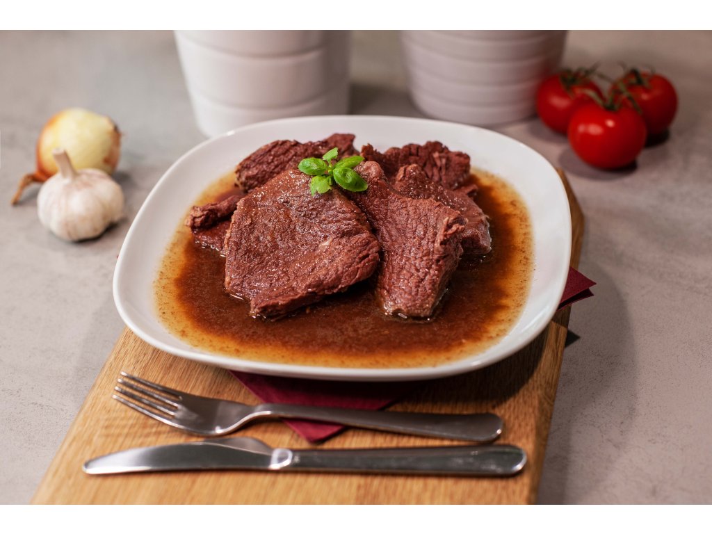 „Echter Wildgeschmack! In Scheiben geschnittene Wildschweinkeule in einer mild gesalzenen Zwiebelmarinade.“